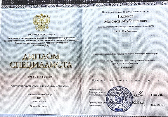 • 2019 г. – Базовое образование: Ростовский государственный медицинский университет (лечебное дело);