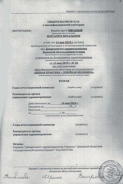 - В июне 2014 года получила сертификат врача-специалиста, пройдя аттестацию на определение профессиональных знаний и навыков в аттестационной комиссии при Донецком национальном медицинском университете им. Горького с присвоением звания врача-специалиста по специальности "Общая практика –семейная медицина".